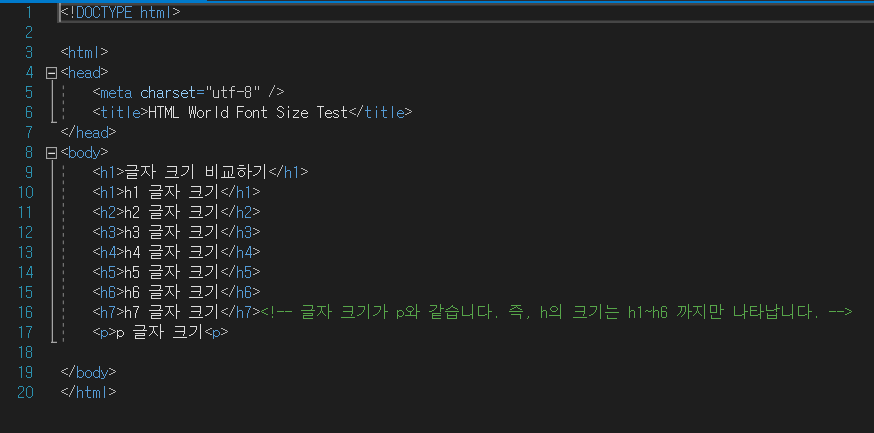 이번 포스팅에서는 HTML의 글자 크기 비교와 글자 태그에 대하여 설명하도록 하겠습니다.