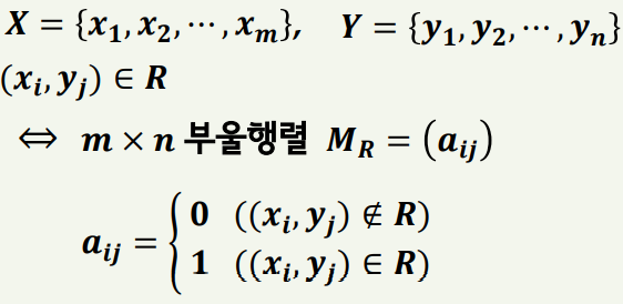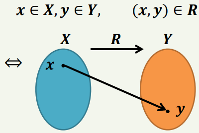 𝑿, 𝒀 ∶ 집합 𝑹 ∶ 𝑿에서 𝒀로의 관계