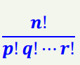 | 𝟎 ≤ 𝒓 ≤ 𝒏을 만족하는 정수 n, r에 대하여, n개의 원소를 갖는 집합에서 순서를 고려해서 r개의 원소를 뽑는 경우의 수 | 중복된 원소를 허용하는 중복집합의 크기가 n이고 그 중에서 중복된 원소의 개수가 각각 p개, q개, ⋯ , r개가 있 을 때, n개 모두를 일렬로 배열하는 경우의 수 |