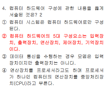 1. 컴퓨터 소프트웨어 + 하드웨어 2. 5대 구성요소 => 입력/출력/연산/제어/기억 3. 데이터 통신을 수행하는 경우 모델은 입출력 장치 4. CPU : 기억/해석/연산/제어 모두 진행 |