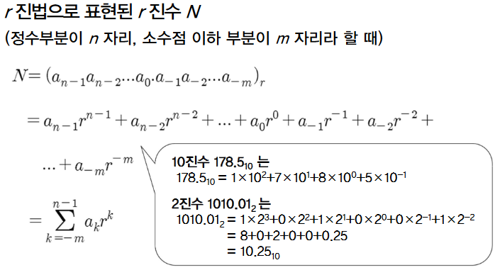 - 숫자의 위치에 따라 가중치(기수(2 이상의 양의 정수)의 거듭제곱) 부여