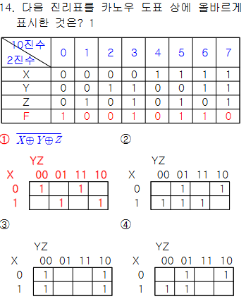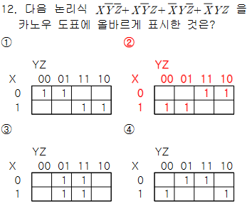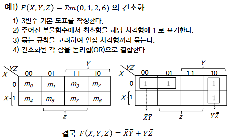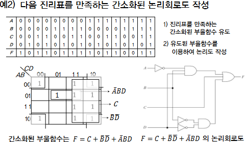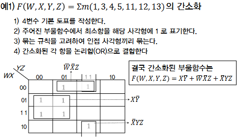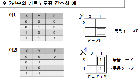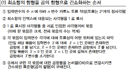 - 카르노 도표 사용, 부울함수의 각 항들을 곱이나 합 형태로 간소화