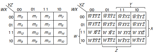 | 4 개의 변수를 가지는 부울함수 => 16개의 최소항 (16개의 정사각형으로 구성) | |