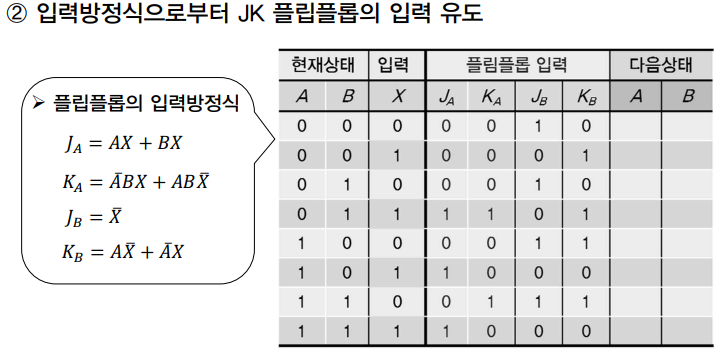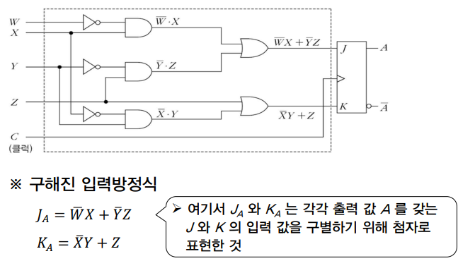 | 플립플롭의 입력방적식 - 플립플롭의 입력 => 조합논리회로의 출력 - 조합논리회로의 출력함수가 플립플롭의 입력함수 |