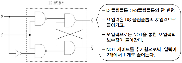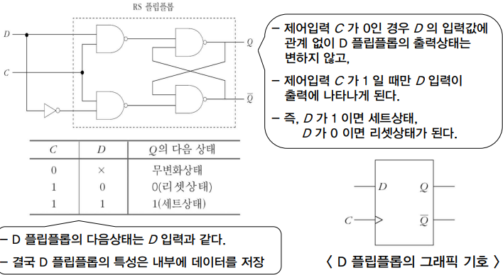 - D 플립플롭은 제어입력으로 클럭펄스가 사용, 논리-1레벨로 변할 때마다 트리거가 된다