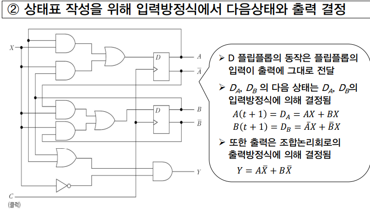 - 입출력 관계를 규명, 시간지연요소인 플립플롭이 포함되어 회로의 시간적 변화를 고려