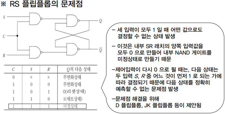 - 단점 : 논리게이트로 구성되는 시간지연소자는 게이트간의 피드백 때문에 예측 못한 상태로 동작하거나 불안정한 상태