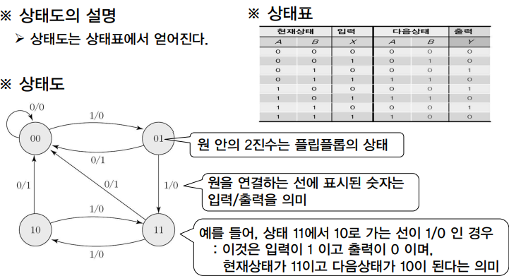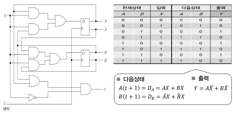 - 입출력 관계를 규명, 시간지연요소인 플립플롭이 포함되어 회로의 시간적 변화를 고려