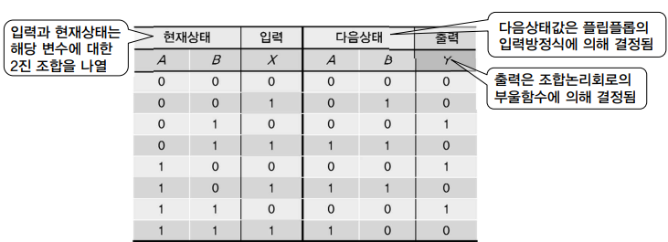 상태표 (구성 : 현재상태, 입력, 다음 상태, 출력) - 순서논리회로에서 플립플롭의 상태와 입력, 출력의 변화를 나타낸 표 |