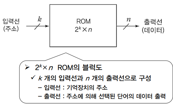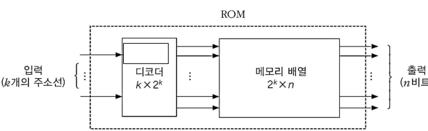 - K개의 입력이 디코더로 2^k개의 디코더 출력 중 하나가 1 - 디코더 출력이 메모리 배열 중 1개의 단어를 출력, 단어의 비트들이 출력단자에 나타남 |