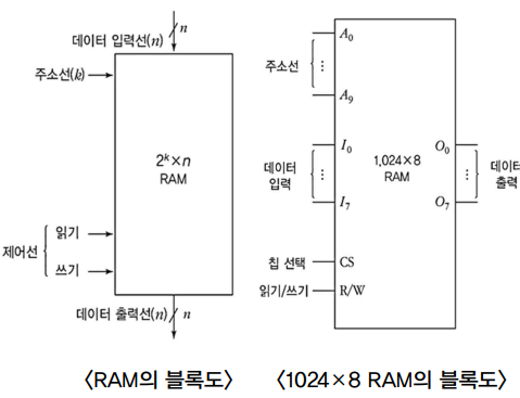- 데이터 입,출력선 : 저장시킬 정보를 저장장치에 전달, 외부장치로 내보내기 - 주소선 : 기억장치 내의 단어를 선택 - 제어선 : 쓰기는 정보 -> 기억장치 / 읽기는 정보 -> 외부 - 기억장치 규모 : 저장할 수 있는 단어의 수와 각 단어를 구성하는 비트 수 2^k x n (단어수 x 비트) |