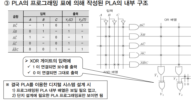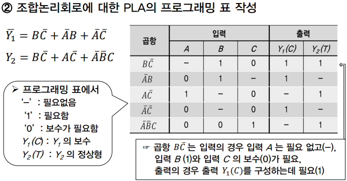 | PLA를 이용한 부울함수 - PLA 내부를 구성하는 AND-OR 배열을 프로그래밍 - 조합논리회로의 논리를 나타내는 PLA 프로그래밍 표 작성 |