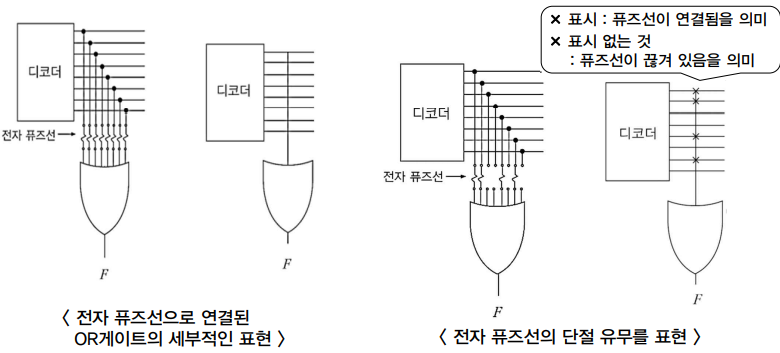 - 디코더와 여러 개의 OR 게이트로 구성 => 내부의 전자 퓨즈선으로 구성, 전원 유무에 상관 없이 유지