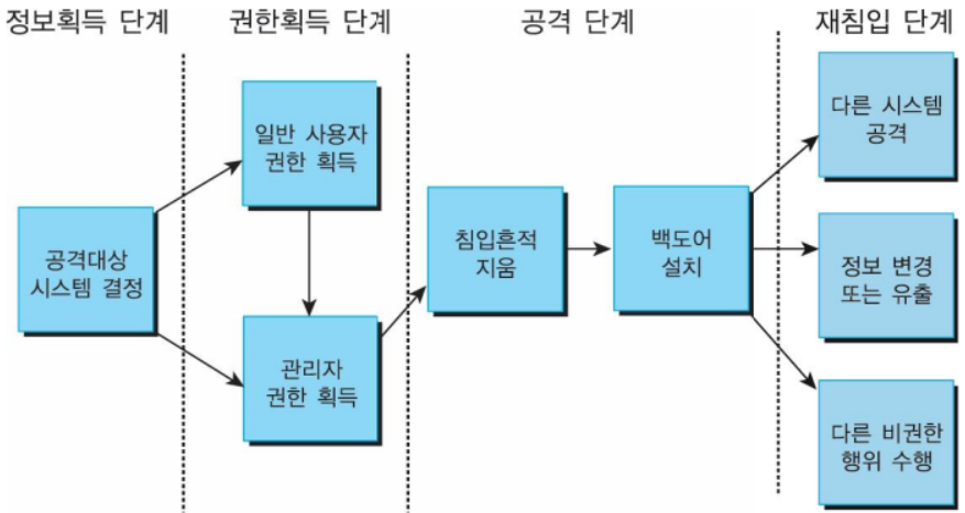 | 4강 | 사이버 공격의 개요 인터넷을 통해 손상을 입히려는 행동으로 잘못된 설정을 이용해 관리자 권한을 얻는 초보적 방식이 대수 다양한 사이버 공격 악성코드 : 악영향을 끼칠 수 있는 소프트웨어의 총칭 - 목적 : 시스템 손상, 전파, 정보 유출 등 - 무분별한 인터넷 사용으로 감염 - ex) 바이러스, 웜, 트로이 목마, 백도어, 스파이웨어, 랜섬웨어 등 네트워크 공격 스캐닝 : 공격을 위한 사전 정보수집, 미리 자신의 시스템 및 네트워크의 보안 취약점을 점검 스푸핑 : 공격자의 제어 하에 있는 호스트를 피해 호스트가 신뢰하는 호스트로 가장하여 정보를 수집/가로채는 방식 스니핑 : 네트워크상의 데이터를 도청 서비스 거부 (DoS) : 가용성을 떨어트리는 결과를 초래, 대량의 데이터를 전송하거나 네트워크 연결을 요청 - SYN flooding 공격 : TCP 연결들을 생성하여 시스템을 서비스 거부 상태로 만듦 - 분산 서비스 거부 (DDoS) : 여러 대의 공격자를 분산적으로 배치해 동시에 서비스 거부 공격 - 피싱 : 사칭하여 개인정보나 금융정보를 얻어냄 - 피밍 : 사용자의 PC의 도메인 정보를 조작, 공식적으로 운영하고 있는 도메인 자체를 중간에서 탈취 최근의 사이버 공격 방식 - 에이전트화, 분산화, 자동화, 은닉화가 상호 의존적으로 발전 - 분산 서비스 거부 (DDoS) 공격이 대표적 - APT 방식 : 특정 대상을 목표로 다양한 공격 기술을 이용해 은밀하게 지속적으로 긴 시간동안 공격 |