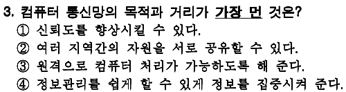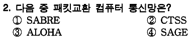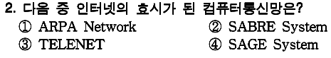 정답 : 3 1. 여객기 예약 업무 처리 2. ??? 3. 무선 패킷 교환 네트워크 4. 컴퓨터와 통신을 결합시킨 최초의 컴퓨터 통신 시스템 |
