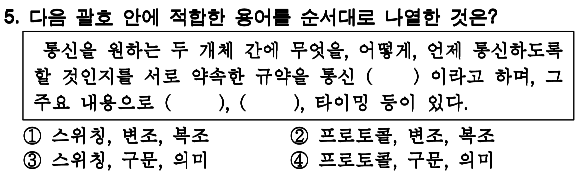 정답 : 4 통신 프로토콜 -> 무엇을, 언제, 어떻게 통신 |