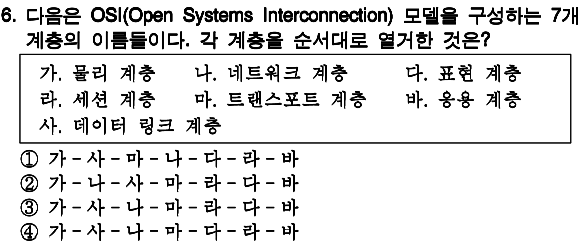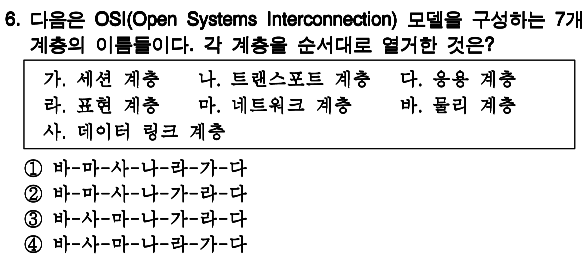 정답 : 3 물리 - 데이터 링크 - 네트워크 - 트랜스포트 - 세션 - 표현 - 응용 계층 |