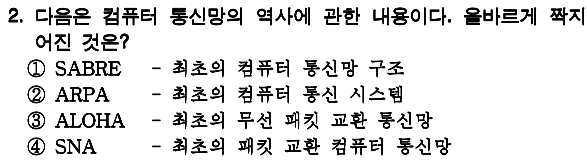 정답 : 3 1. SABRE : 컴퓨터와 통신을 결합시킨 최초의 컴퓨터 통신 시스템 2. ARPA : 패킷 교환 네트워크 |