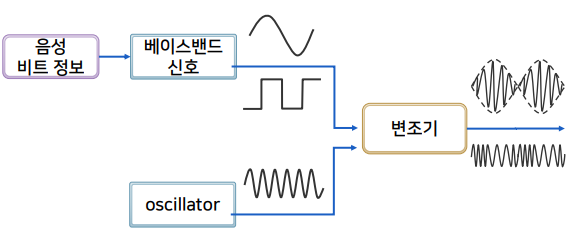 변조 : 전송 신호를 높은 주파수 대역의 반송파 신호에 싣는 과정