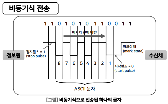 | 데이터 블록을 한꺼번에 전송 ex.ASCII 문자 전송 | 한 문자씩 전송, 문자 사이에는 특별한 시간적 제약 X 시작 펄스 : 문자의 첫 번째 비트 검출 정지 펄스 : 문자의 끝 |