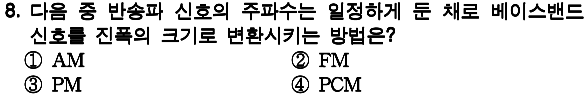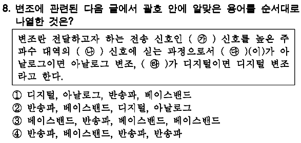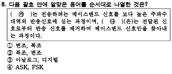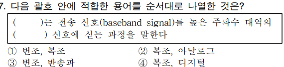 정답 : 1 2. 주파수 변화 3. 위상각의 변화 4. 디지털, 위상편이 변조 |