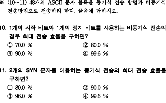 정답 : 2 - 전송 효율 : (48 x 8) /(48 x 10) x 100 = 80.00% 정답 : 3 - 전송 효율 : 48 x 8/((48 +2) x 8) x 100 = 99.70% |