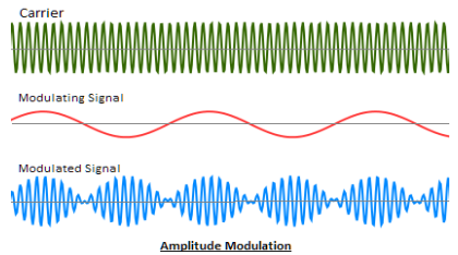| 진폭 변조(Amplitude Modulation, AM) 베이스 밴드 신호의 순간 진폭에 비례해 반송파 신호의 순간 진폭을 변화 |