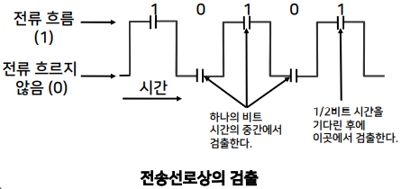 | 비트 동기 : 송수신 측에 동일한 클록 사용, 비트 검출 위치는 각 비트의 중앙 | |