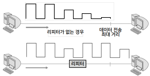 - 여러 대의 리피터를 사용하면 장거리 사용 가능하지만 시간 지연 발생