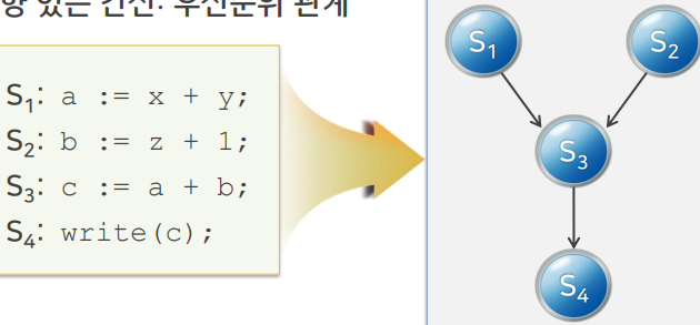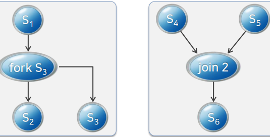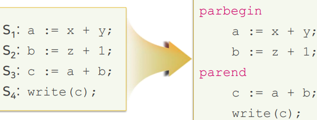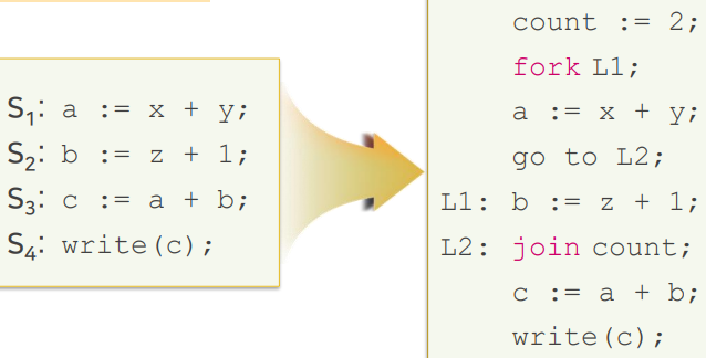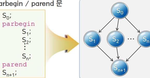 | 1개의 프로세스가 여러 가닥의 병렬 프로세스로 분할되었다가 하나로 결합 parbegin / parend 문 ![]() |