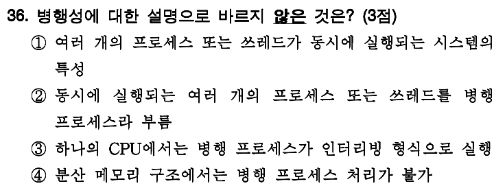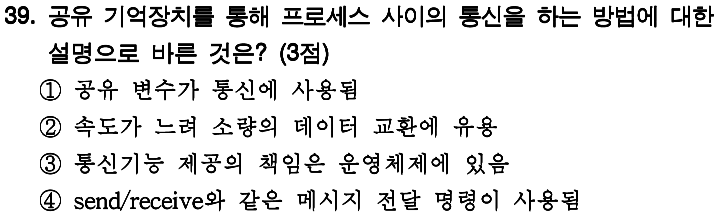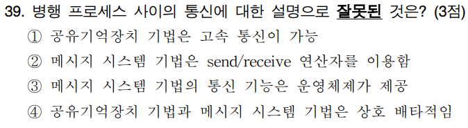 정답 : 4 4. 분산 메모리 구조에서도 병행 프로세스 처리 가능 |