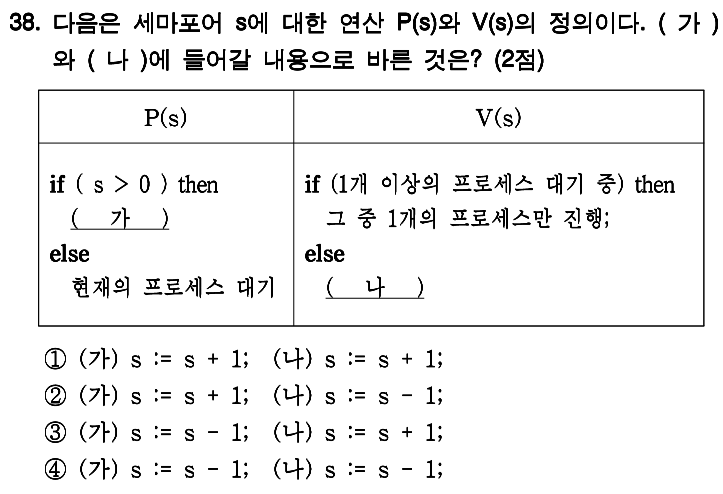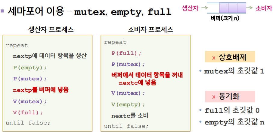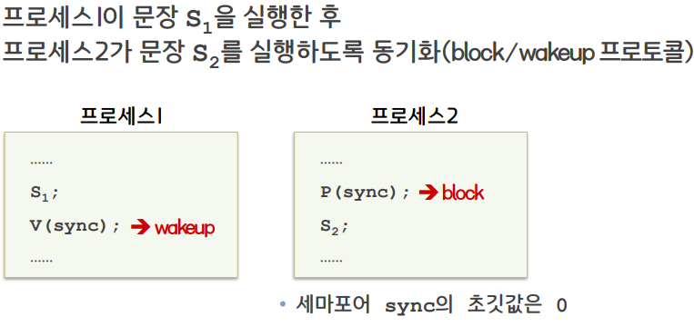 - 세마포어 s는 두 표준단위 연산 P와 V에 의해서만 접근됨