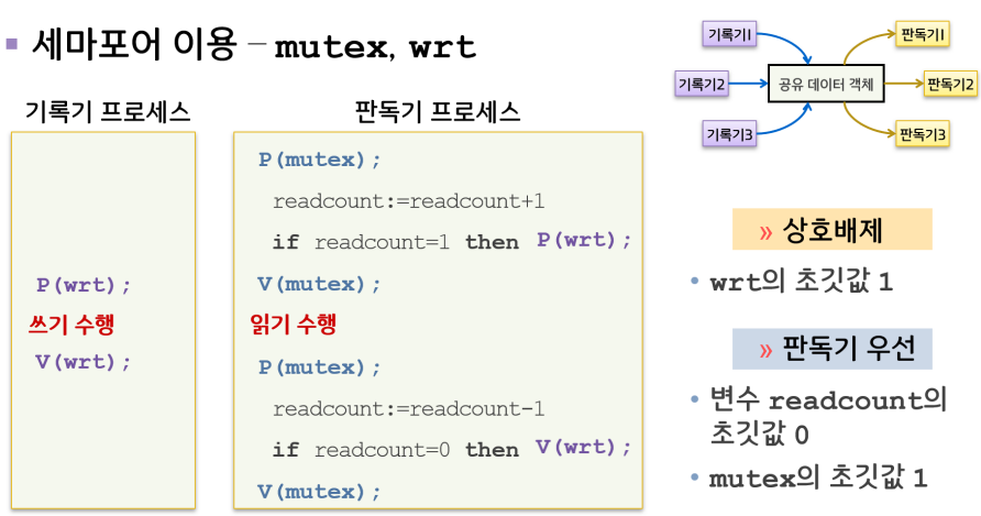 - 제1판독기/기록기 문제(판독기 우선) : 기록기의 기아상태 유발 가능