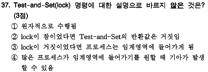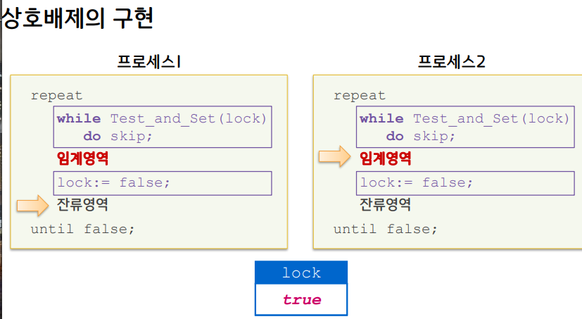 - Test and Set : 상호배제의 하드웨어적 해결 방법, 분리가 불가능한 단일 기계 명령어(원자적으로 수행)