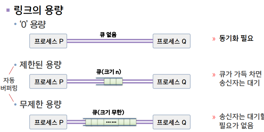 | 프로세스 간에 공유 변수를 이용해 정보를 교환 | 메시지 교환방식으로 정보를 교환, send/recive 연산자 |