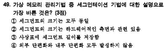 정답 : 3 1. 크기는 모두 다름 2. 외부 단편화 발생 가능 4. 사상표에 세그먼트 비트, 주소 |