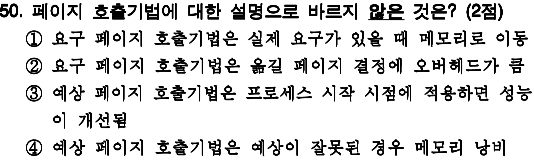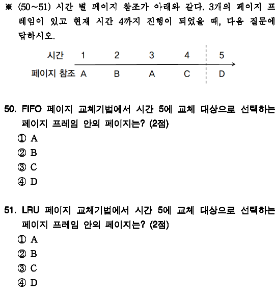정답 : 4 1. 같은 컴퓨터 메모리 사용 2. 메모리 크기 < 용량 큰 프로세스 실행 가능 3. 프로세스가 참조하는 주소와 메모리에서 사용되는 주소 무관 |