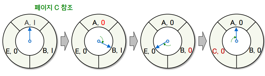 교체 대상 선택 방법 1. 큐의 선두를 꺼내 참조 비트 조사 2. 참조 비트가 0 -> 교체 대상 3. 참조 비트가 1 -> 0으로 바꿔 큐 뒤 |