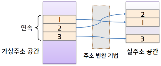 - 인위적 연속성 : 가상주소 공간에서는 연속, 실주소 공간은 연속 X