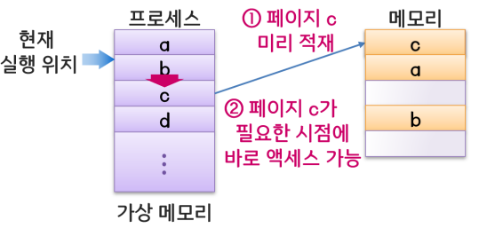 - 현재 요구되지는 않지만 곧 사용될 것으로 예상되는 페이지를 미리 메모리로 이동