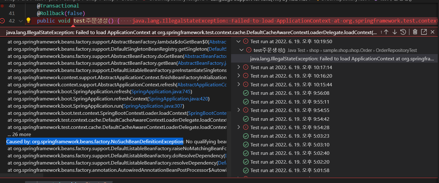 Caused by: org.springframework.beans.factory.NoSuchBeanDefinitionException: No qualifying bean of type 'sample.shop.repository.OrderRepository' available: expected at least 1 bean which qualifies as autowire candidate. Dependency annotations: {@org.springframework.beans.factory.annotation.Autowired(required=true)}