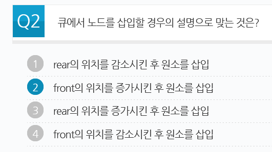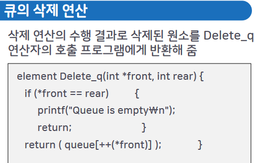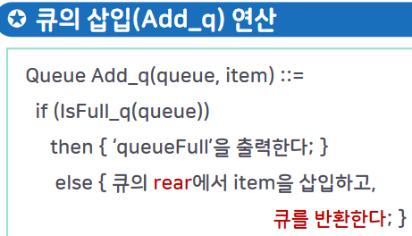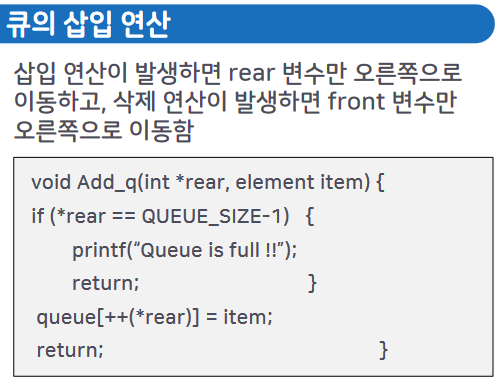 큐의 생성 : 변수 rear 초기값은 큐의 공백 상태를 나타내는 -1로 시작함