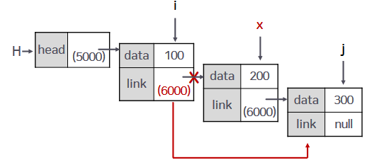 | 삭제할 노드의 선행 노드의 링크 필드를 삭제할 노드의 후행 노드를 가리키게 하여 삭제할 노드를 메모리에 반환 | |