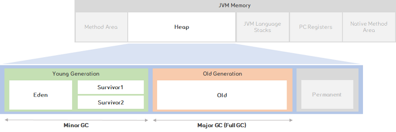 Minor GC : young 영역, eden이 full 되었을 때 Major GC : old 영역, minor GC가 실패 할 때 Full GC : 전체 heap + permament, Minor, Major GC가 실패 할 때 |