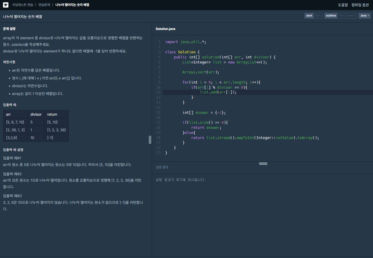 나누어 떨어지는 숫자 배열(https://school.programmers.co.kr/learn/courses/30/lessons/12910)