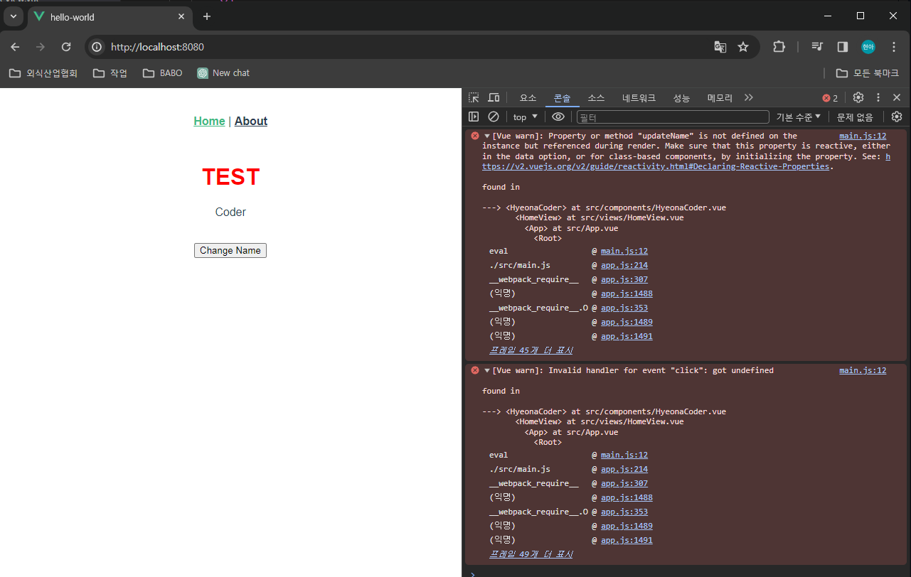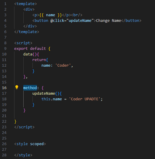 [Vue.js] Property or method "updateName" is not defined on the instance but referenced during render. // Invalid handler for event "click": got undefined 에러 본문