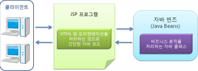 클라이언트 <-> JSP(HTML, 프리젠테이션을 처리하는 코드와 간단한 자바 코드) <-> 자바 빈즈(비즈니스 로직을 처리하는 자바 클래스)