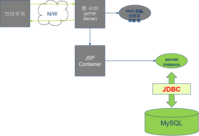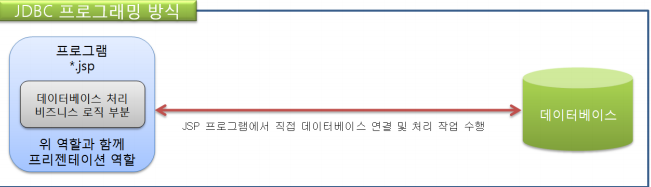 <-(JSP 프로그램에서 직접 데이터베이스 연결 및 처리 작업 수행)-> DB