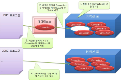 - 데이터베이스 연결 작업은 서버의 자원을 이용하는 작업, 계속적으로 발생한다면 시스템에 상당히 부하를 주는 요소