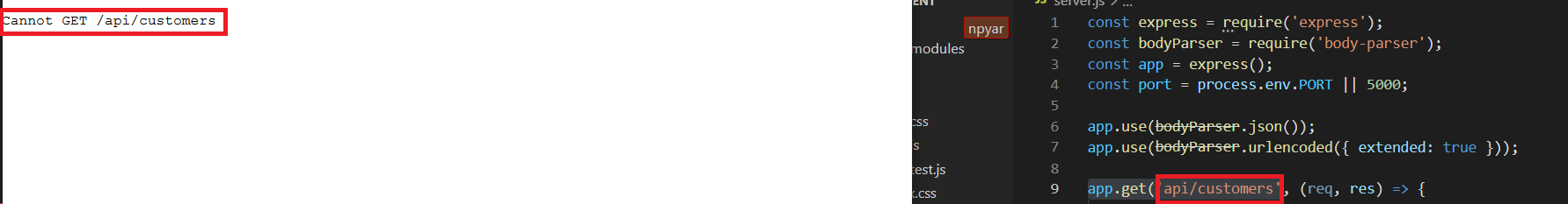 app.get('api/customers' 로 작성했던 것.. api 앞이 무언가 허전하지 않는가? 우리가 빼먹고 작성하지 않았던 것은 바로 슬래시이다. '/' 요녀석.